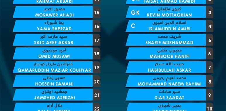 برخلاف گمانه زنی ها، اسم رامین صافی در لیست دیده نمی شود. نام یحیی شیرزی و سید عارف اکبر برای اولین بار در لیست دیده می شود. مازیار کوهیار هم بعد از مدت های طولانی در ترکیب دعوت شده گان به تیم ملی اضافه شده است. باقی بازیکنان همان های هستند که در آخرین مسابقات افغانستان در ترکیب بوده اند. چند بازیکن از جمله جبار شرزه، فرید سادات، سید مرتضی فاطمی، امید پوپلزی، عمید آرزو، سید رضا حسینی و نجم حیدری نیز در لیست حضور ندارند. بر خلاف توقع، اسم بلال آرزو باز هم در ترکیب دیده می شود.